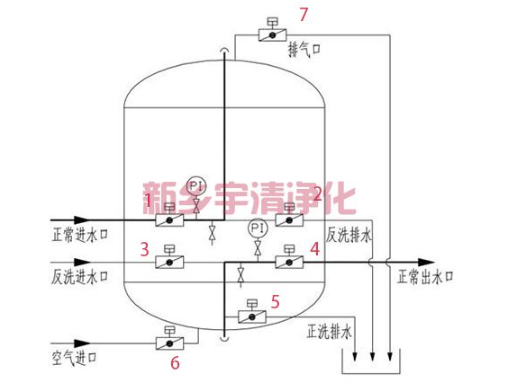 反洗狀態(tài):閥門2、閥門3打開;閥門1、閥門4、閥門5關(guān)閉,此時水從下部集水器進入濾層并對濾料進行沖洗,沖洗后雜質(zhì)與水從上布水器流出至排污管道。(直徑大于2200的多介質(zhì)過濾器簡易采用壓縮空氣+水洗方式,清洗效果更好,只需在反洗時打開閥門6)