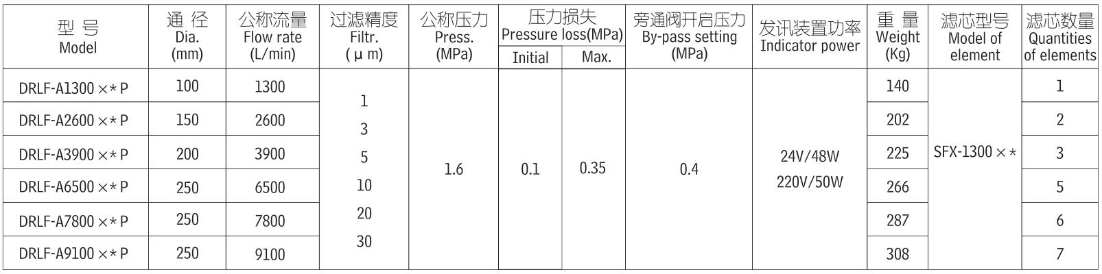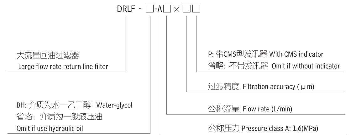 注:*為過濾精度 如過濾油液為一般液壓油,流量1300L/min、精度10微米,配置發(fā)訊器 型號為DRLF-1300*10P,濾芯型號為SFX-1300*10。