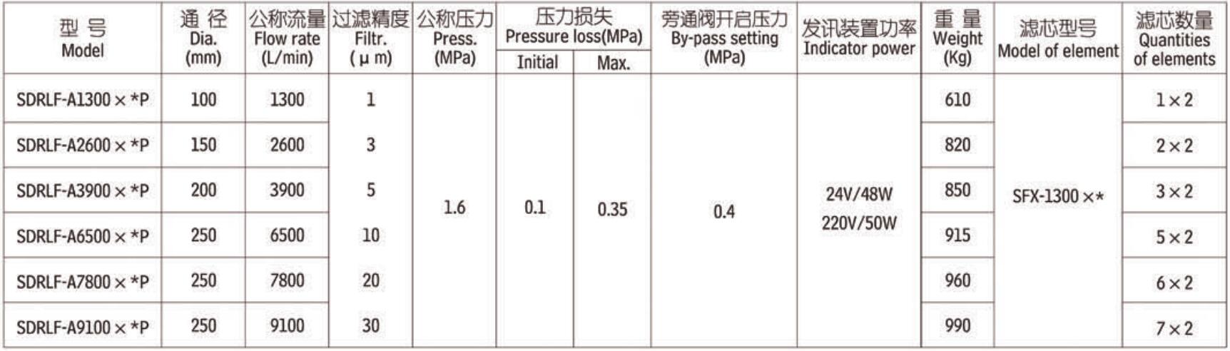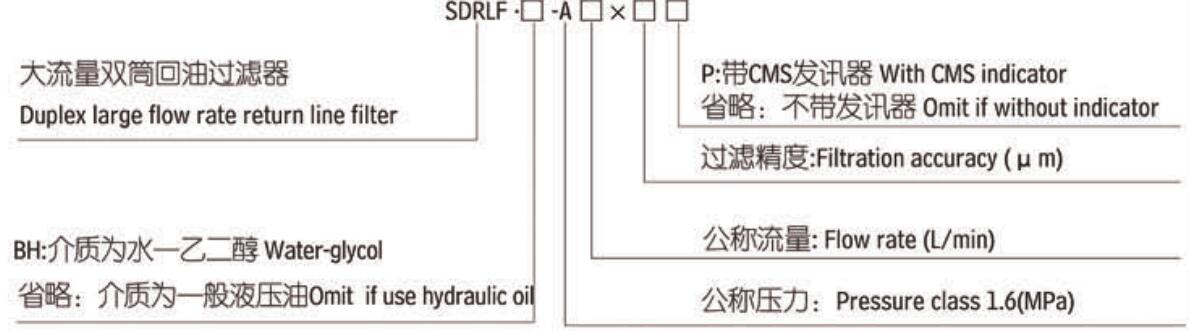 注:*為過(guò)濾精度 如過(guò)濾油液為一般液壓油,流量1300L/min、精度10微米,配置發(fā)訊器 型號(hào)為SDRLF-A1300*10P,濾芯型號(hào)為SFX-1300*10。