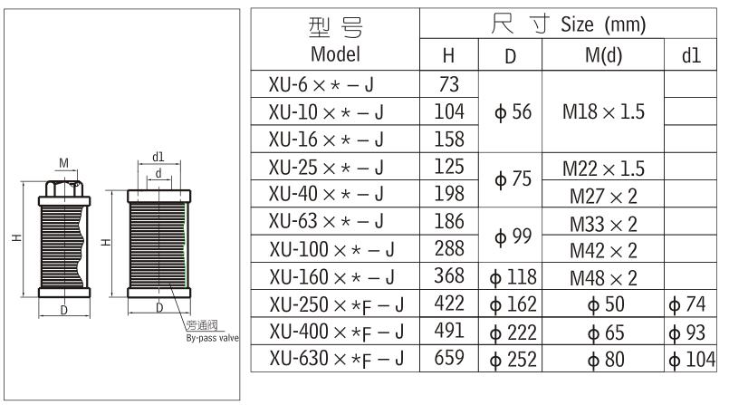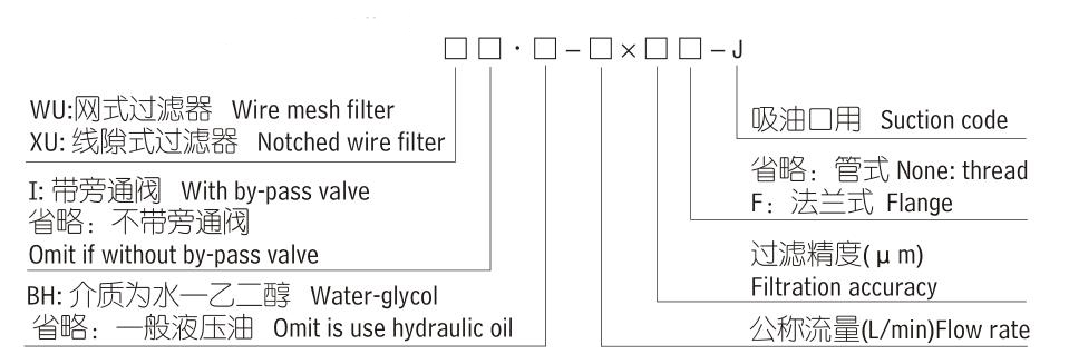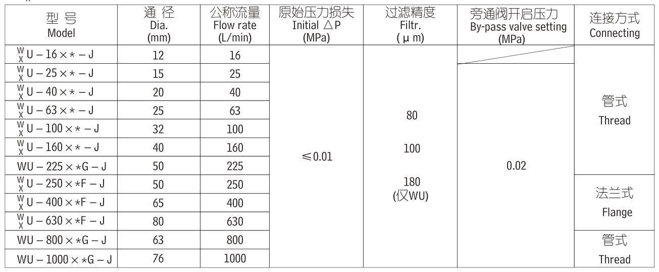 注:*為過濾精度 如流量63L/min、精度100微米,則型號(hào)為XU-63*100-J